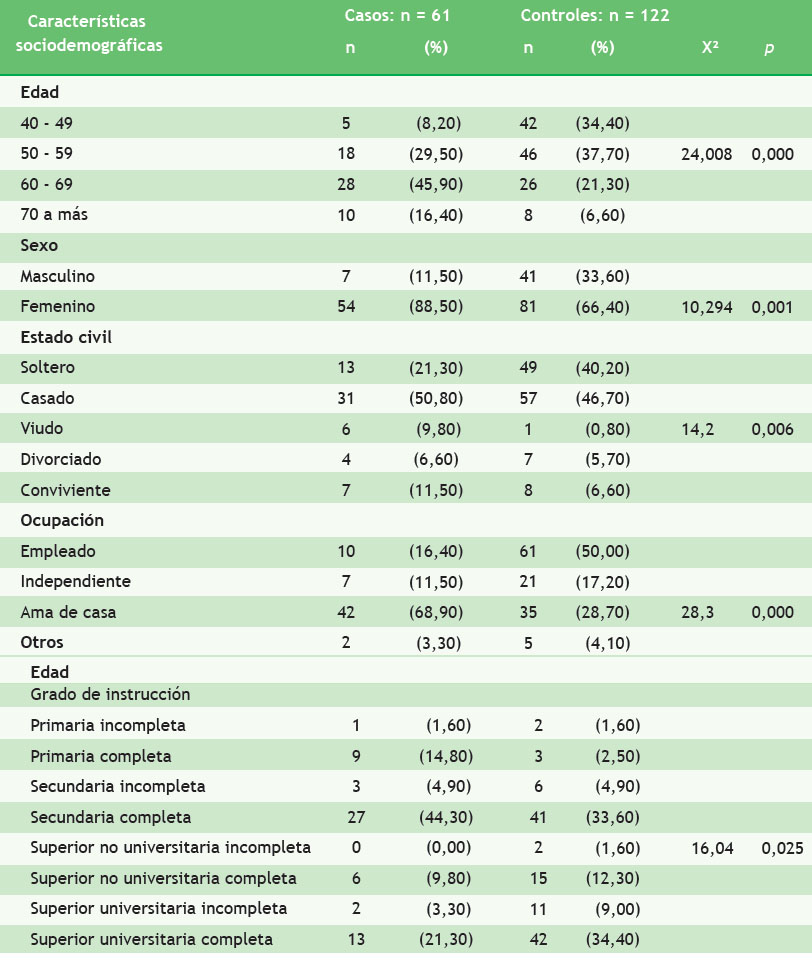 El rango de edad que predominó en el grupo de casos fue de 60 a 69 años con un 45,90 % (n = 28); y en el grupo de controles fue de 50 a 59 años con un 37,70 % (n = 46). Entre los "casos", la ocupación de "ama de casa" tuvo una frecuencia de 68,90 % (n = 42), y en los "controles" fue de 28,70 % (n = 35). En los casos, el grado de instrucción que predominó fue "secundaria completa" con 44,30 % (n = 27), y en los controles, fue "superior universitario completa": 34,40 % ( n = 42). Se encontró que la edad, sexo, estado civil, ocupación y grado de instrucción están estadísticamente asociados con la gonartrosis (Tabla 1).