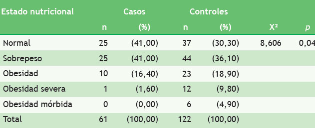 En relación al índice de masa corporal, en ambas poblaciones (casos y controles) se observó que el estado nutricional que predominó fue el sobrepeso ( 41,00 % en los casos y 36,10 % en los controles) lo cual difiere con lo señalado por Charles- Lozoya et al. que identificaron la obesidad como estado nutricional más frecuente (63,9 % en los casos y 55,7 % en los controles) 18. Estas diferencias pueden deberse a que el primer estudio se realizó en un Servicio de Unidad Médica de Alta Especialidad, y en nuestro hospital de estudio acuden pacientes con diferentes comorbilidades.