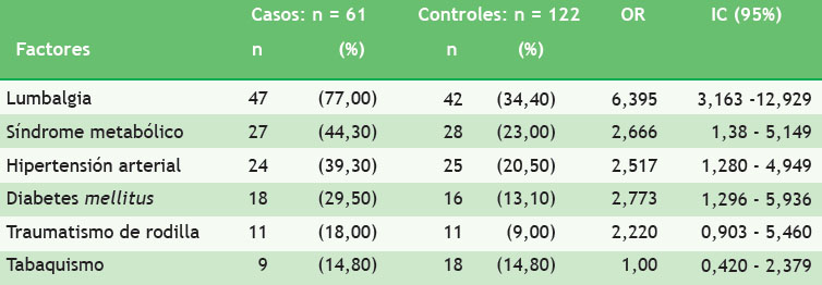 La Tabla 3 muestra el análisis univariado que presenta las variables estudiadas. La lumbalgia se encontró en el 77,00 % de los casos (n = 47) y en los controles, en 34,40 % (n = 42); síndrome metabólico en 44, 30 % (n = 27) de los casos y el 23,00 % (n = 28) de los controles; mientras que la HTA aparece en el 39,30 % (n = 24) de los casos y 20,50 % (n = 25) de los controles ; la DM tipo 2 se encontró en el 29,50 % de los casos (n= 18) y en 13,10 % (n = 16) de los controles; el antecedente de traumatismo de rodilla apareció en el 18,00 % (n = 11) de los casos y el 9,00 % (n = 11) de los controles , y el tabaquismo se presentó en 14,80 % (n = 9) de los casos y en el 14,80 % (n = 18) de los controles.