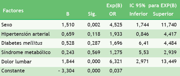 Según el análisis de regresión logística, la lumbalgia y el sexo resultaron estadísticamente significativos (p < 0,05) (Tabla 5).