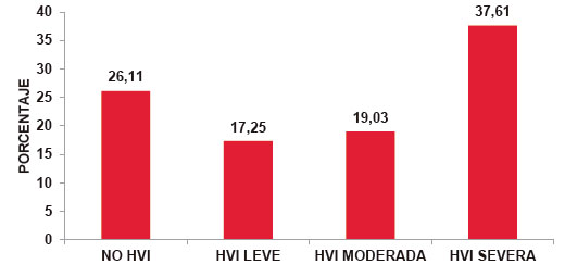 De 226 (100,0 %) pacientes hipertensos, 59 (26,11 %) no tuvieron HVI, mientras que 167 (73,89 %) tuvieron diagnóstico de HVI. De este último grupo, 85 (37,61 %) pacientes presentaron HVI severa; 43 (19,03 %), HVI moderada; y 39 (17,25 %) pacientes, HVI leve. Así mismo, se infiere que de cada 3 pacientes hipertensos, 1 presenta HVI severa (Figura 2).