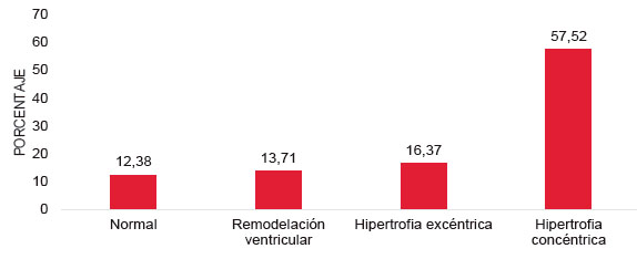 En la Figura 3 se muestran las características de la HVI, según el patrón geométrico ventricular. Evalúa a 226 pacientes hipertensos (100,00 %): 130 (57,52 %), presentaron HVI de tipo concéntrica; 37 (16,37 %) de tipo excéntrico; 31 (13,71 %), remodelación ventricular; y en un porcentaje bajo se encontró el patrón geométrico normal (12,38 %).
