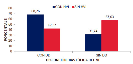 De 226 (100,00 %) pacientes hipertensos, 167 (73,89 %) presentaron DDVI. En la Figura 4 se observa que la presencia de HVI estuvo asociada a una mayor frecuencia de DDVI en el 68,26 % (114), en comparación a los pacientes sin HVI, que solo presentaron en el 42,37 % 25, lo que es estadísticamente significativo (X2= 12,34; p = 0,001). Además, existe casi 3 veces más riesgo de presentar disfunción diastólica del VI en los pacientes hipertensos con HVI en comparación a los que no lo son (OR=2,92; IC95 %: 1,58 -5,38).