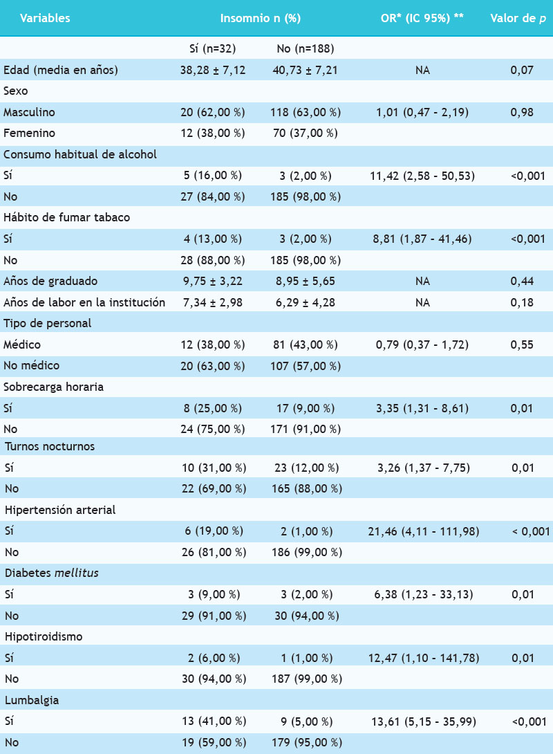 La muestra estuvo conformada por 220 profesionales de la salud, de los cuales 32 (17,00 %) padece de insomnio. La Tabla 1 muestra el análisis bivariado de las características sociodemográficas, laborales y clínicas asociadas a insomnio en los profesionales de la salud. Las características sociodemográficas significativamente asociadas a insomnio son el consumo habitual de alcohol, así como el hábito de fumar. Los factores laborales asociados a insomnio fueron la sobrecarga horaria y los turnos nocturnos. Finalmente, los factores clínicos asociados a insomnio, se observa que la hipertensión arterial, la diabetes mellitus, el hipotiroidismo, así como la lumbalgia, tienen un nivel de asociación significativo en el insomnio en profesionales de la salud.
