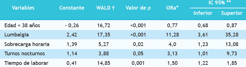 En la Tabla 2 se muestra el análisis multivariado con OR ajustado (ORa) de los factores asociados a insomnio en profesionales de la salud. Se observa que hay menor probabilidad de insomnio en profesionales con edad menor a 38 años (ORa de 0,77; IC 95%: 0,68 - 0,87; p < 0,001). Por otro lado, se observa hay más probabilidad de que los profesionales sufran insomnio cuando está asociado a lumbalgia (OR de 11,28; IC 95%: 3,61-35,28; p < 0,05), sobrecarga horaria en el trabajo (OR de 4; IC 95%: 1,22-9,73; p < 0,05), en los que realizan turnos nocturnos (OR de 3,12; IC 95 %: 1,01-9,73; p < 0,05), y en aquellos que tienen más de siete años de labor en la institución (OR de 1,50 ; IC 95%: 1,22 - 1,85 ; p <0,05).