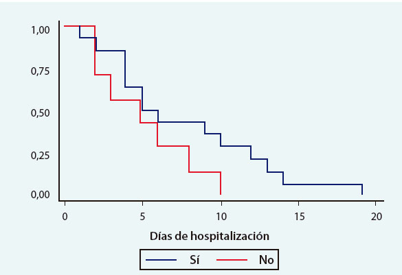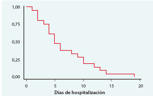 A los cinco días de estancia hospitalaria la probabilidad de sobrevida general de pacientes con COVID-19 es del 43,48 % y al día 10 se redujo al 17,39 %. Antes de los 20 días de hospitalización todos fallecieron (Figura 1).