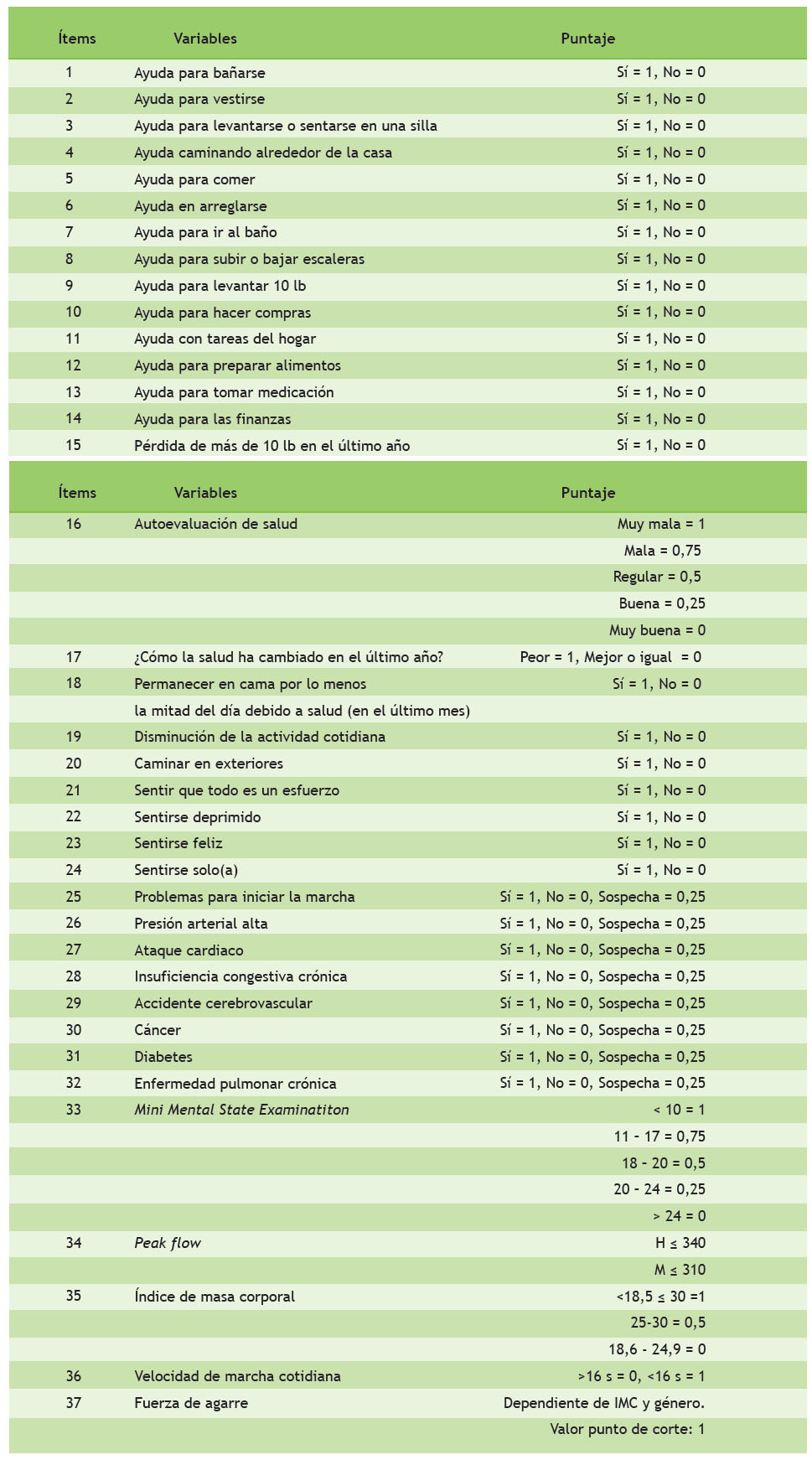 En la Tabla 1 se presentan los ítems incluidos en el índice de fragilidad. De la pregunta 1 a la 8 se evaluaron actividades cotidianas extraídas del índice de Barthel 14; el ítem 9 fue extraído de una pregunta sobre sarcopenia 4. Los parámetros del 10 al 14 evaluaron actividades instrumentales, mediante componentes del índice de Lawton15. En el ítem 15 (pérdida de peso) se inquirió "¿Ha notado que ha bajado de peso como para notar que su ropa le queda más suelta?", pregunta que pertenece a la escala de Edmonton 16. El ítem número 16 fue el autoreporte de salud categorizado en 4 opciones, en el que las opciones "excelente" y "muy buena" fueron consideradas en la categoría superior. La actividad física fue evaluada por las pregunta 17 al 24, la información se obtuvo de Physical Activity Scale for the Elderly (PASE) 17. Las preguntas sobre trastorno afectivos (ítems 21 al 24) provienen del Geriatric Depression Scale (GDS) 18. Los problemas en el inicio de la marcha (ítem 25) tienen como parámetro al SPPB 19. Desde el 26 al 32 se consideran los antecedentes patológicos en la historia clínica. La pregunta 33 fue analizada con el Mini Mental State Examination, versión peruana 20 y permitió evaluar el deterioro cognitivo con un punto de corte ≤ 24 puntos 21. El ítem numero 34 evaluó el flujo pico de la espirometría (dato de las historias clínicas). El índice de masa corporal (ítem 35) se calculó con el peso y talla registrados en la historia clínica, al inicio del seguimiento. Los ítems 36 y 37 fueron velocidad de marcha y fuerza de presión: como marcha lenta se consideró una velocidad de marcha lenta según el 20 % del tiempo más lento en una caminata de 4 metros ajustada por sexo y altura media en centímetros (Hombres: tiempo mayor o igual que 4,9 segundos con una altura menor o igual que 159 cm, o un tiempo mayor o igual a 6,5 segundos con una altura mayor que 159 cm. Mujeres: tiempo mayor o igual a 6,5 segundos a una altura de menor o igual 153,7 cm, o un tiempo mayor que 7 segundos con una talla mayor que 153,7 cm) 11. La fuerza de prensión se consideró como debilidad (según el estudio original). En los hombres los valores son los siguientes: fuerza ≤ 23 (para IMC ≤ 22 - 24), ≤ 25 (para IMC 24 - 28) y ≤ 25,5 (con IMC > 29,5). En caso de mujeres: fuerza ≤ 24 (IMC 21), ≤ 17 (IMC 21 - 24) , ≤ 23 (IMC 24 - 28) y ≤ 24 (IMC > 28) 11.