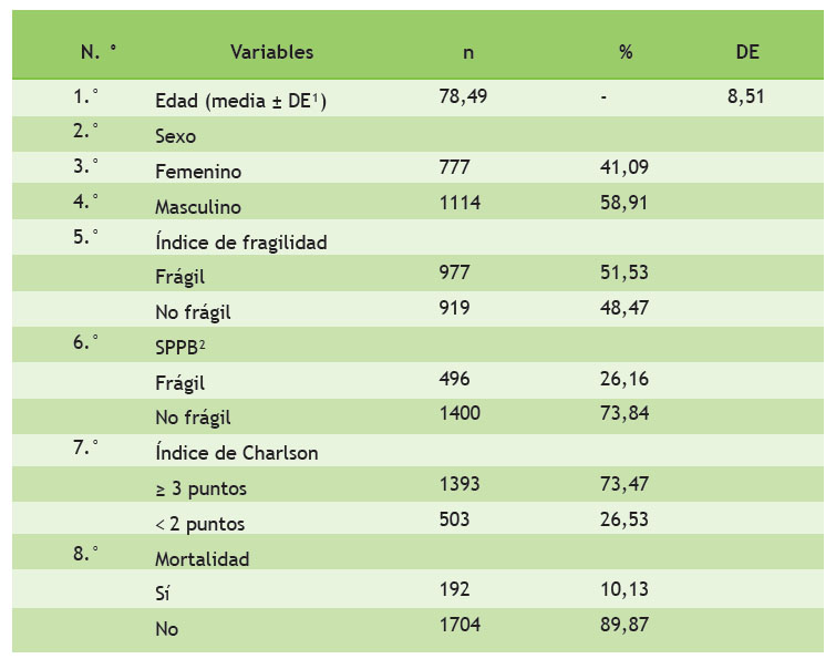 El promedio de edad de la base de datos es de 78,49 con una media ± desviación estándar de 8,51 %. En la variable sexo, se muestra una elevada prevalencia de varones (58,91 %) en comparación con las mujeres (41,09 %). Según el índice de fragilidad encontramos que el 51,53 % son frágiles, pero con el SPPB, la frecuencia es de un 26,16 %; por último, se evidencia un índice de Charlson alterado (73,47 %). La frecuencia de mortalidad en el estudio de 10,13 % (Tabla 3).