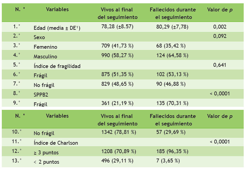 En el análisis bivariado en base a mortalidad en la muestra estudiada, se observó una diferencia de mortalidad según sexo, y un porcentaje mayor de varones. En relación con la edad, los fallecidos tenían mayor promedio de edad que los supervivientes. En el grupo de los que murieron durante el seguimiento, el 53,13 % eran frágiles según el índice de fragilidad; y el 70,31 % lo era de acuerdo al SPPB. Además, el 96,35 % tenía un puntaje anormal en el índice de Charlson. Solamente se encontró significancia estadística en relación con SPPB e índice de Charlson (Tabla 4).