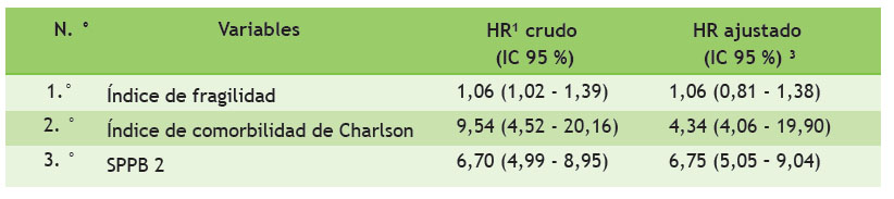 Los dos modelos de regresión de Cox (crudo y ajustado) se muestran en la tabla 5. En el primer modelo se observa que el índice de fragilidad incrementa el riesgo de mortalidad al igual que el índice de Charlson y el SPPB; sin embargo, cuando se realiza el modelo ajustado según sexo, se pierde la significancia del índice de fragilidad, pero se mantiene la significancia del SPPB y del índice de Charlson (Tabla 5). No se realizó un modelo ajustado según edad, ya que el índice de Charlson presenta puntajes adicionales ajustados por edad.