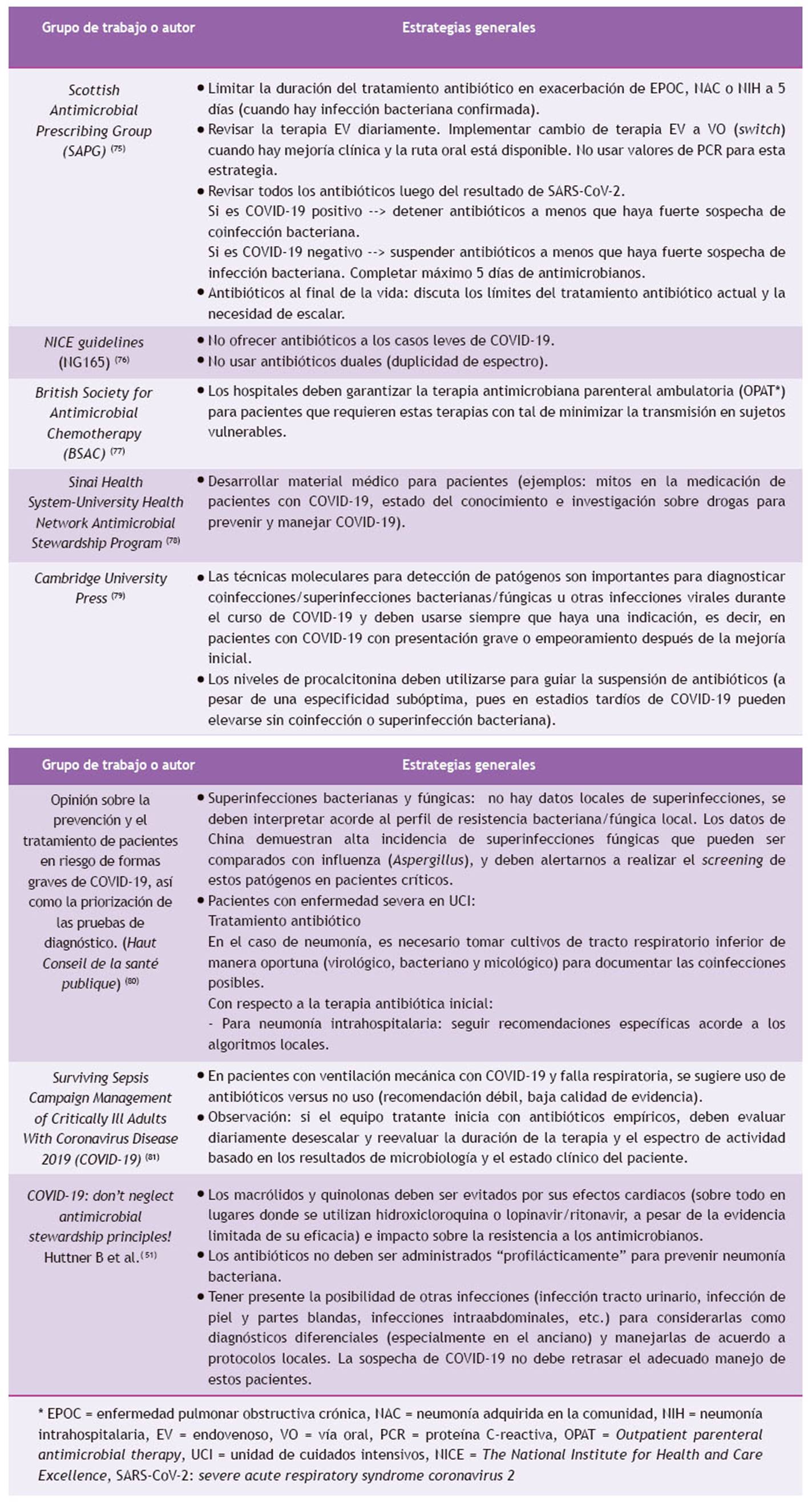 El uso de antimicrobianos en la COVID-19 debería guiarse por las estrategias de los programas de optimización de uso de antimicrobianos (PROA) locales 5,6. Estos son equipos multidisciplinarios conformados, principalmente, por profesionales de los servicios de infectología, microbiología y servicio farmacéutico, acompañados de miembros del equipo de control de infecciones, unidades de cuidados intensivos, entre otros 7. Su rol es promover el uso adecuado de los antimicrobianos para contener la aparición de organismos multirresistentes y minimizar efectos adversos (toxicidad, candidemia, colitis por Clostridioides difficile), a través de estrategias como la auditoría prospectiva/restrictiva o construcción de algoritmos locales de terapia antimicrobiana con base en perfiles de resistencia antimicrobiana (RAM) de cada hospital 5,6, entre otras. A pesar de que no hay recomendaciones formales para incluir a los PROA en situaciones de emergencia, estos pueden tener impacto en la respuesta frente a la pandemia de COVID-19 5.
