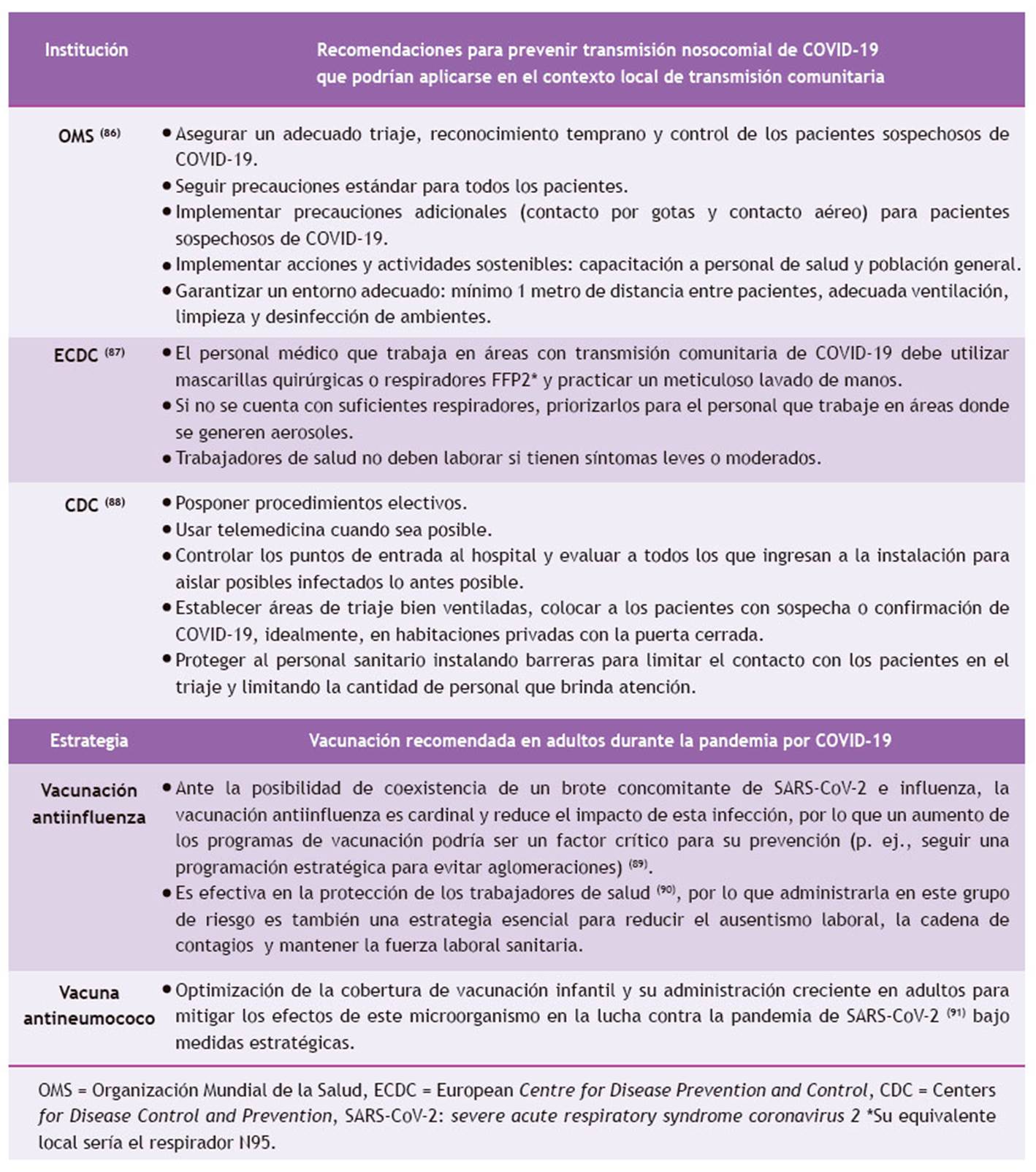 Sin embargo, dadas las condiciones de la pandemia actual en Perú, donde existe transmisión comunitaria y, posiblemente, escasa proporción de prácticas de prevención adecuadas por los trabajadores de salud en epidemias, basadas en algunas experiencias locales previas de la epidemia de influenza A H1N1 83, es razonable que los médicos puedan ser víctimas y transmisores de SARS-CoV-2 para los pacientes hospitalizados por otros motivos. En la Tabla 3 se presenta el resumen de recomendaciones internacionales e intervenciones para prevenir la transmisión nosocomial de COVID-19 que pueden ser adaptadas al contexto local.