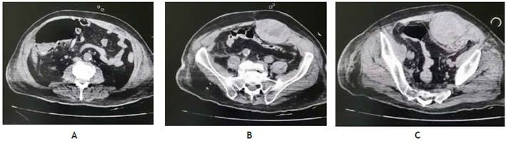 Figura 1 TAC simple de abdomen con evidencia de (A) neumatosis en ángulo cólico derecho, (B) neumatosis mesentérica y (C) hematoma abdominal