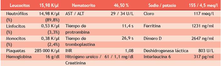 Se mantuvo con anticoagulación por presentar valores elevados de dímero D al momento del ingreso (2647 ng/ml) (Tabla 1). Durante la evolución, el paciente presentó un fallo renal agudo oligúrico con cifras de creatinina mayores de 2 mg/dl, que remitió durante su estadía hospitalaria con el empleo de diuréticos de asa. Asimismo, desarrolló una neumonía grave por COVID-19 complicada con sobreinfección bacteriana pulmonar. Los hemocultivos reportaron crecimiento de cocos grampositivos a las 12 horas, por lo que inició terapia con vancomicina, polimixina E y amikacina con base en la epidemiología de la unidad.