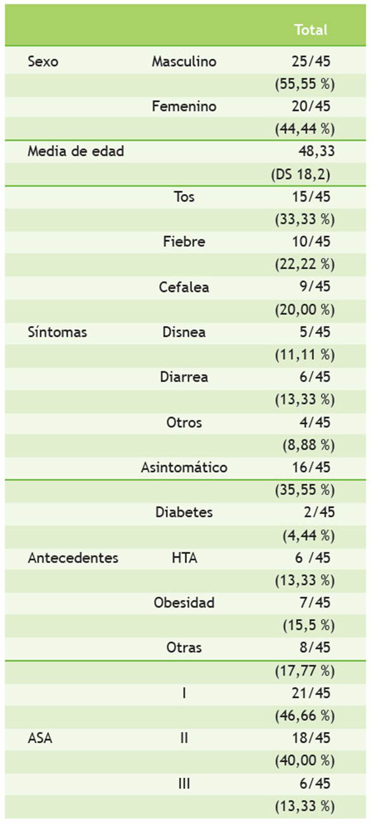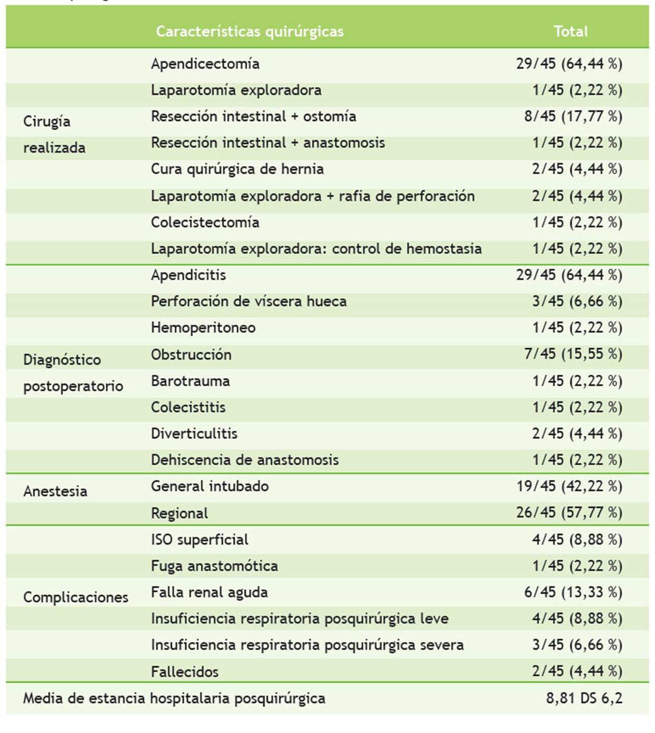 En la Tabla 3 se muestran las cirugías realizadas, el 64,44 % fueron apendicectomías. La anestesia regional fue utilizada en el 57,77 % de los casos. Dentro de las complicaciones observadas, las más frecuentes fueron la insuficiencia renal aguda y la insuficiencia respiratoria. Solamente un paciente ingresó a la unidad de cuidados intensivos (UCI), mientas que tres presentaron disnea y mejoraron con oxígeno suplementario. Dos pacientes fallecieron (4,44 %).