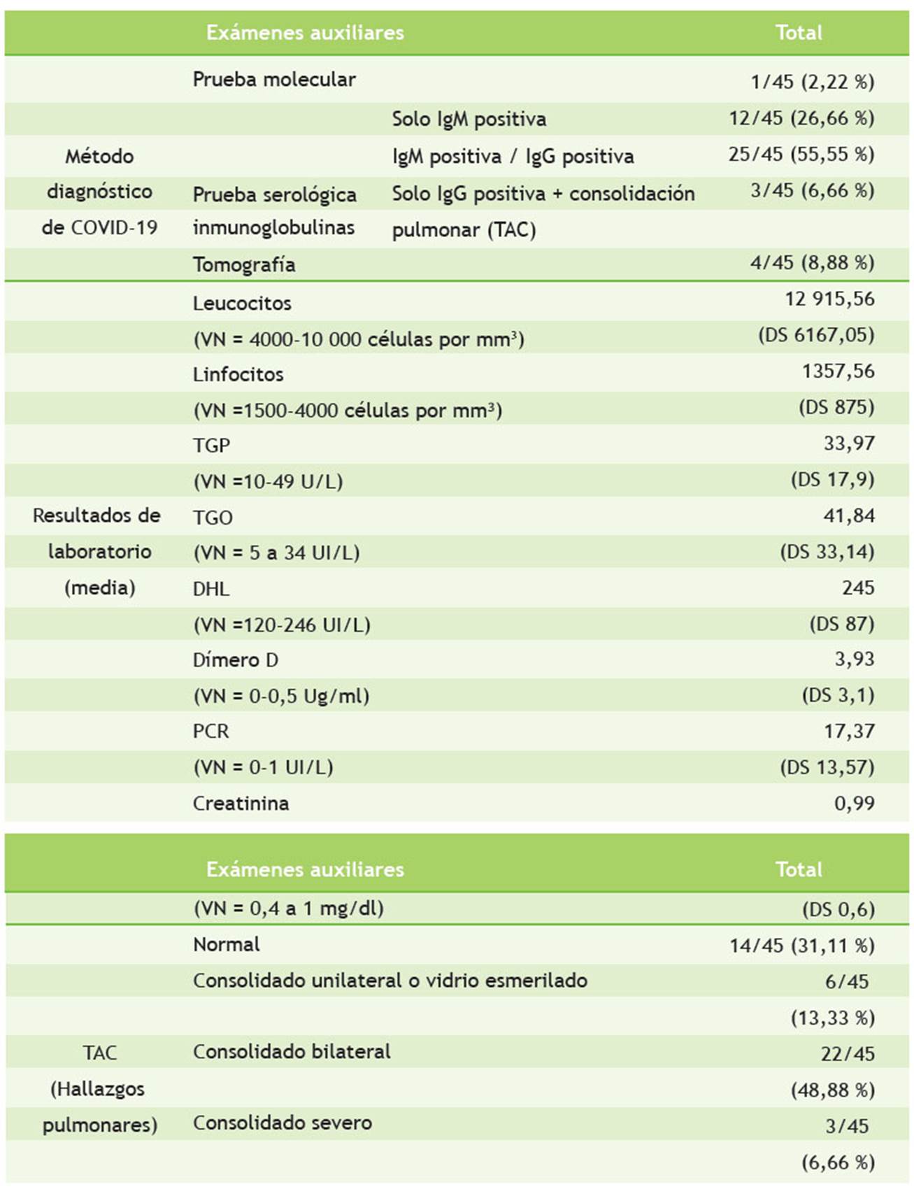 El mejor estudio diagnóstico es la prueba molecular (PCR). En el Perú, las pruebas de detección de anticuerpos IgM e IgG (pruebas rápidas o serológicas) son las de mayor disponibilidad, que presentan, como un gran defecto, la incapacidad de detectar la respuesta en los primeros días de la infección, y como principal ventaja, su bajo costo y resultados inmediatos. En nuestro estudio, nos guiamos por el cuadro clínico, las pruebas serológicas y los hallazgos pulmonares en la tomografía computada (TAC) cuando no se cuenta con la prueba molecular. La TAC proporciona bases importantes para el diagnóstico temprano en estos pacientes. Las imágenes que se toman como referencia son, en su mayoría, opacidades en vidrio esmerilado y en parches en las áreas periféricas debajo de la pleura con consolidación parcial 11. En este trabajo todos los pacientes tuvieron una tomografía computada.
