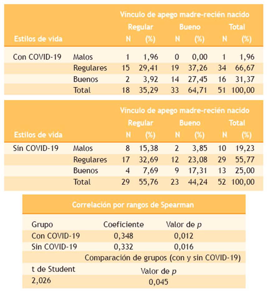 La Tabla 1 muestra que los estilos de vida en puérperas con COVID-19 se califican como malos (1,96 %), regulares (66,67 %) y buenos (31,37 %); mientras que en puérperas sin COVID-19, malos (19,23 %), regulares (55,77%) y buenos (25,00 %). El vínculo de apego madre-recién nacido en el grupo con COVID-19 es regular en el 35,29 % y bueno en el 64,71 %; y en el grupo sin la enfermedad es regular en el 55,76 % de las participantes y bueno en el 44,24 %. En ambos grupos, la correlación entre el estilo de vida y el vínculo de apego madre-recién nacido es significativa (p < 0,05). La diferencia entre ambos grupos no es significativa (p < 0,05), lo que sugiere que el COVID-19 tiene un impacto significativo sobre la relación entre los estilos de vida y el vínculo de apego madre-recién nacido (Tabla 1).