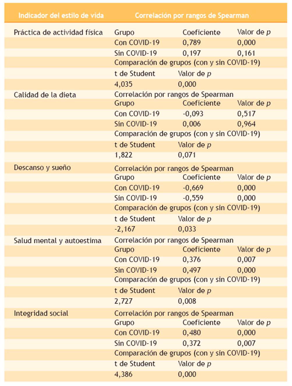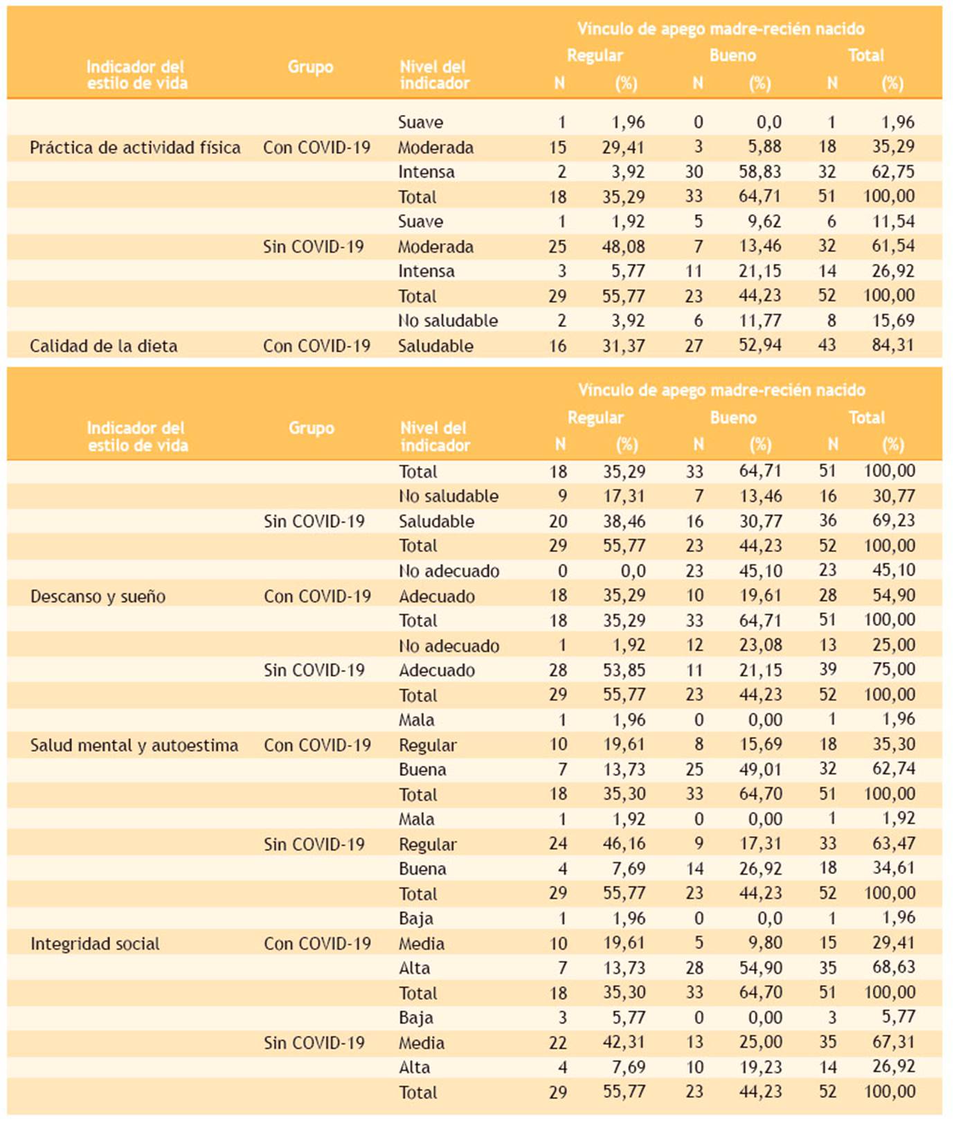 En las puérperas con COVID-19 la práctica de actividad física fue calificada como suave (1,96 %), moderada (35,29 %) e intensa (62,75 %); mientras que en el grupo sin COVID-19 fue suave (11,54 %), moderada (61,54 %) e intensa (26,92 %). En relación a la calidad de la dieta, en el grupo con COVID-19 el 15,69 % se define como no saludable y el 84,31%, como saludable; en el grupo sin COVID-19 encontramos que el 30,77 % fue no saludable y el 69,23 % resultó saludable. Respecto al descanso y sueño, el 45,10 % de las participantes con COVID-10 mostró un resultado no adecuado, y el 54,90 %, adecuado; para el grupo sin COVID-19, los resultados fueron no adecuado en 25,00 % y adecuado en 75,00 %. Respecto a la salud mental y la autoestima encontramos las siguientes calificaciones: en el grupo con COVID-19, fue mala en el 1,96 %; regular, en el 35,30 %; y buena, en el 62,74 %. Mientras que en las puérperas sin COVID-19, fue mala en el 1,92 %; regular, en el 63,47 %; y buena, en el 34,61 %. La integridad social inherente a los estilos de vida en el grupo con COVID-19 resultó baja (1,96 %), media (29,41 %) y alta (68,63 %); y en el grupo sin COVID-19 es baja (5,77 %), media (67,31 %) y alta (26,92 %) (Tabla 2).