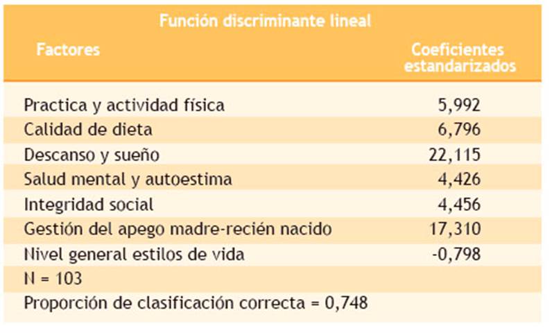 En la Tabla 4 se muestra el análisis discriminante lineal sobre datos relacionados con el impacto de la COVID-19 sobre la relación entre estilo de vida y el vínculo de apego madre-recién nacido en un hospital en Perú, donde se observa que el descanso y sueño y el vínculo de apego madre-recién nacido tienen mayor peso y determinan el impacto del COVID-19 sobre la relación entre estilos de vida y el vínculo de apego madre-recién nacido, permitiendo así discriminar a los dos grupos (con y sin COVID-19)(Tabla 4).