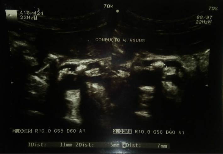 En el examen presenta un regular estado general. Ventila espontáneamente, sin dificultad. Tiene una SatO₂:95 %, PA: 80/60 mmHg y las demás funciones vitales eran estables. Peso = 44 kg, talla = 1,58 m, IMC = 17,6 kg/ m2, pálida (+/+++), moderado pasaje del murmullo vesicular sin ruidos agregados y dolor a la palpación profunda en epigastrio e hipocondrio derecho. En el resto de la evaluación no muestra nada particular. Se solicitan exámenes auxiliares y se inicia tratamiento con escopolamina e hidratación con NaCl 0,9 %. Exámenes auxiliares: glicemia= 670 mg/dL; creatinina = 0, 94 mg/dL; urea= 24 mg/dL; hemograma= 13 320 leucocitos/ uL (Ab:4 %, Seg:73%, Eo:2 %, Mon:1 %, Linf:20 %); Hb=10,3 g/dL; Hto = 32,3%; plaquetas = 684 000/uL; examen de orina (+); Gram s/c= bacilos gramnegativos, 90-95 leucocitos/campo, 8-10 hematíes/campo, trazas de glucosa, nitritos (++/+++). AGA y electrolitos: pH =7,348; pCO₂=39,3 mmHg; HCO₃-= 21,8 mmol/L; Na+ = 123,1 mmol/L; K+ = 3,26 mmol/L; Cl- = 89,2 mmol/L; Ca++ = 0,65 mmol/L; Mg++ = 0,23 mmol/L. Inician el tratamiento con insulina R 10 UI stat y luego a escala. También solicitan un urocultivo e inician la antibioticoterapia. Se indica realizar controles glicémicos en horario y la paciente se hospitaliza. La antibioticoterapia continúa hasta que en el urocultivo aparece una bacteria nosocomial y varía la sensibilidad antibiótica, entonces el tratamiento cambia a imipenen y la evolución continúa de manera favorable. Se inicia terapia con insulina NPH 22 UI/día, la cual se aumenta hasta un máximo de 52 UI/día en un periodo de 15 días; sin embargo, no se logró un adecuado control y la paciente continúa con picos de hiperglicemia y, en algunas oportunidades, seguidos de hipoglicemias de hasta 36 mg/ dL, por lo que se decide cambiar la insulina NPH por insulina glargina, la cual se inicia con 10 UI/día y se aumenta hasta 32 UI/día. Después, se añade insulina tipo aspart 5 UI con el almuerzo y 5 UI con la cena, con lo que se logra un mejor control. Se le solicitó una ecografía (Figura 1), la que muestra litiasis múltiple en el conducto de Wirsung que está dilatado, por lo que se solicita una colangioresonancia que confirma la litiasis en el conducto de Wirsung y su dilatación, así como atrofia pancreática difusa severa, con lo que se diagnostica la pancreatitis crónica. La paciente es dada de alta luego de 30 días de hospitalización con la remisión del cuadro infeccioso, un mejor control glicémico con insulina glargina 26 UI/día, insulina tipo aspart 5 UI con el almuerzo y 5 UI con la cena, y el tratamiento enzimático, así como con indicaciones de control por gastroenterología.