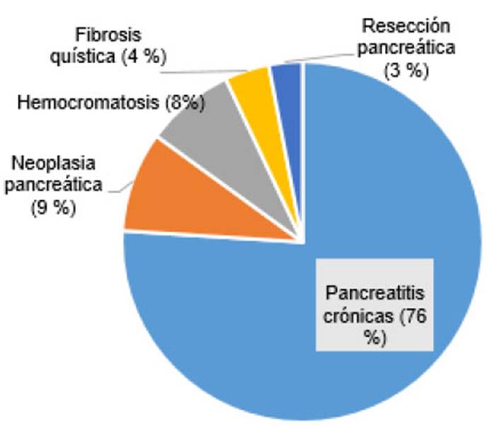 Figura 2 Distribución de las causas de diabetes mellitus tipo 3c. Adaptado de Andersen D et al. Diabetes, Pancreatogenic Diabetes, and Pancreatic Cancer (15)