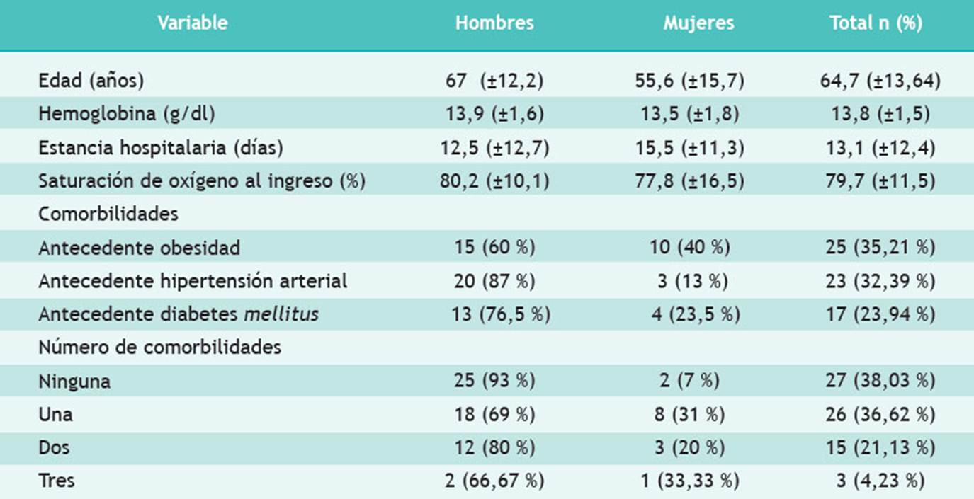 Respecto al mayor porcentaje de hospitalizados según grupo etario, los adultos mayores fueron el grupo más numeroso (64,79 %), seguido de los adultos (33,80 %) y los jóvenes (1,41 %). La mayoría de los pacientes (61,97 %) presentaba al menos una comorbilidad, principalmente obesidad (35,21 %) y, en segundo lugar, hipertensión arterial (32,39 %). Adicionalmente, un 36,23 % de los participantes acudían con SatO₂ menor a 80 %. En los exámenes auxiliares encontramos anemia en un 15,49 %. La mediana de estancia hospitalaria reportada era de 13 días (± 12 días) hasta el desenlace (Tabla 1).