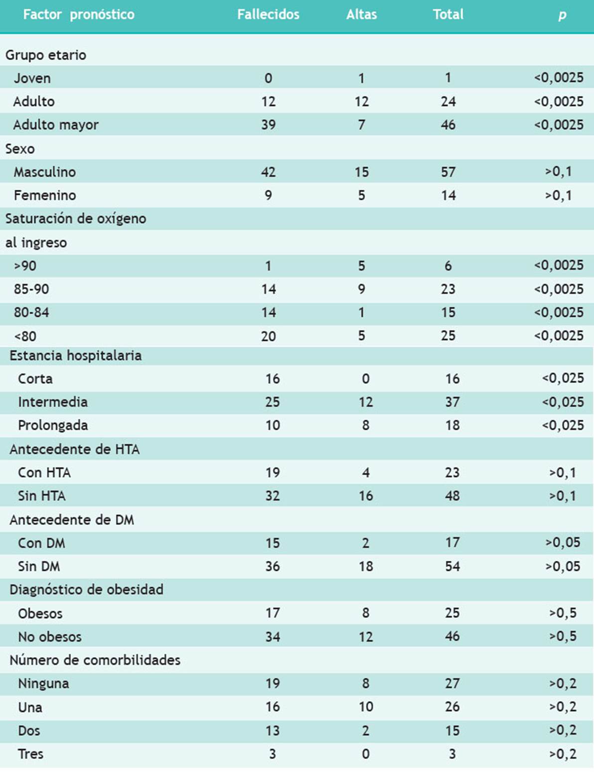 El valor de la saturación de oxígeno <80 % tomada al ingreso se asoció con una mayor mortalidad, en comparación al grupo de los sobrevivientes (p<0,0025). El mayor porcentaje de pacientes hospitalizados que fallecieron (49,02 %, n=25) tuvo una estancia hospitalaria intermedia (p<0,025).