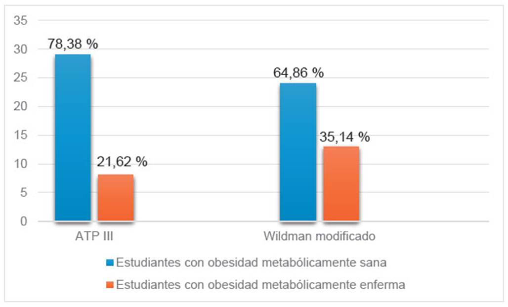 Figura 1 Prevalencia de obesidad metabólicamente sana y enferma en estudiantes de Medicina según ATP III y Wildman modificado