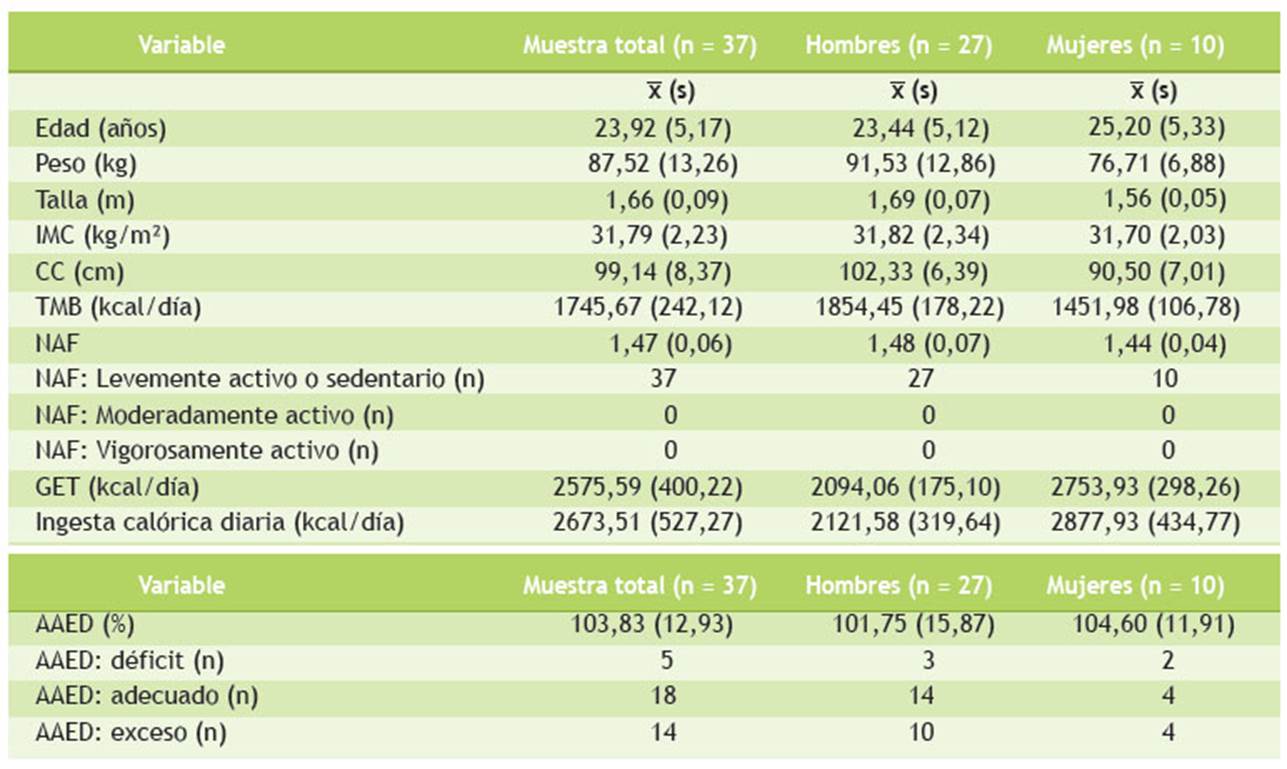 n: número de personas, x̄ : media, s: desviación estándar, IMC: índice de masa corporal, CC: circunferencia de la cintura, TMB: tasa metabólica basal, NAF: nivel de actividad física, GET: gasto energético total, AAED: adecuación del aporte energético diario