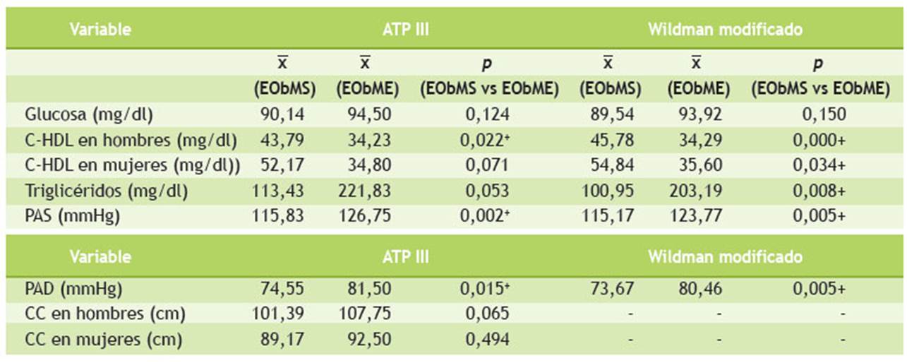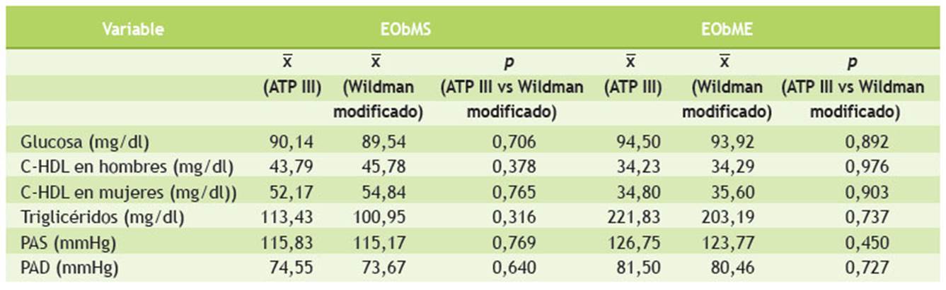 La comparación entre los grupos de EObMS y EObME, según la clasificación de ATP III, mostró diferencias significativas (p < 0,05) en las variables de C-HDL en hombres, PAS y PAD. Así también, de acuerdo con los criterios Wildman modificados, se observó diferencias significativas en las variables de C-HDL en hombres, C-HDL en mujeres, triglicéridos, PAS y PAD (Tabla 2).
