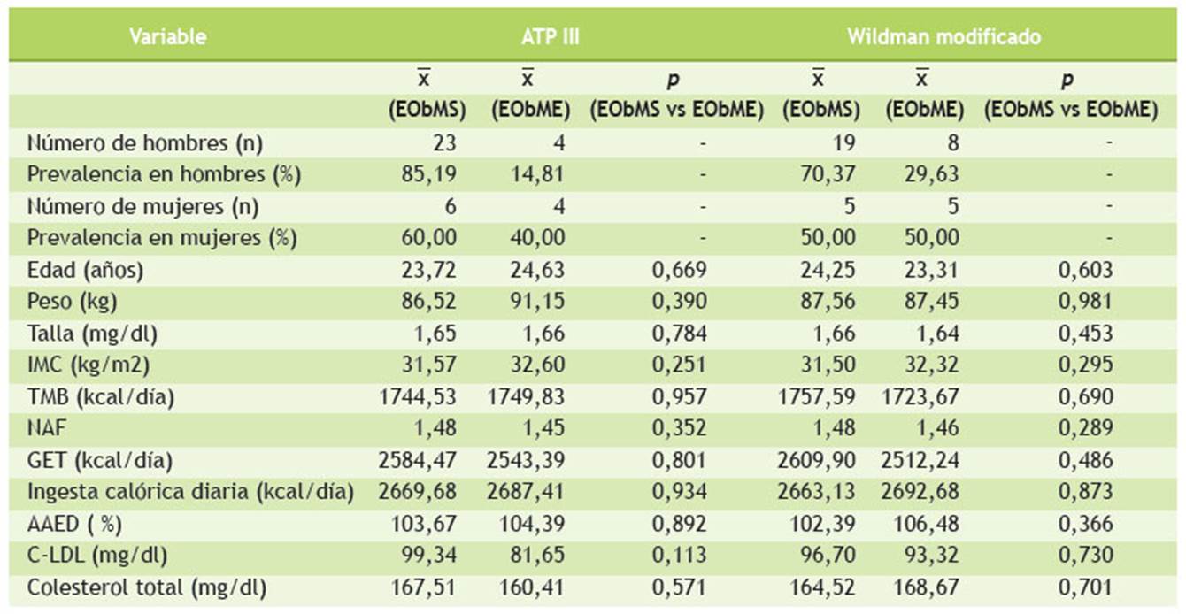 Por otro lado, la comparación entre los grupos de EObMS y EObME clasificados según criterios de ATP III y Wildman modificados, pero con respecto a variables no consideradas en dichos criterios, no mostró diferencias significativas (p > 0,05) en ninguna clasificación ni variable (Tabla 3).