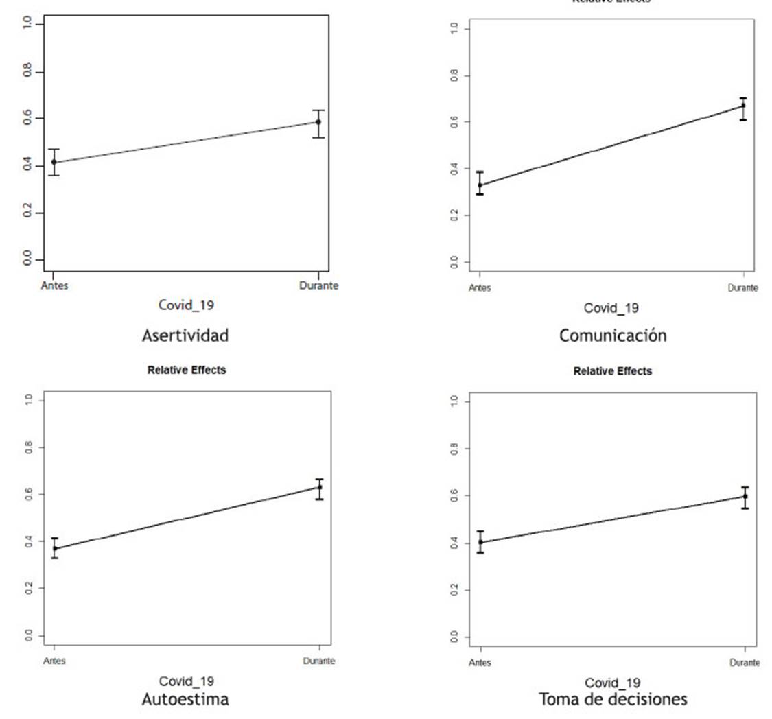 El análisis no paramétrico sugiere que el comportamiento de las habilidades sociales preventivas y sus dimensiones del adolescente variaron significativamente (p < 0,05) después de que se aplicó el programa educativo "Libres de COVID-19" (Tabla 3).