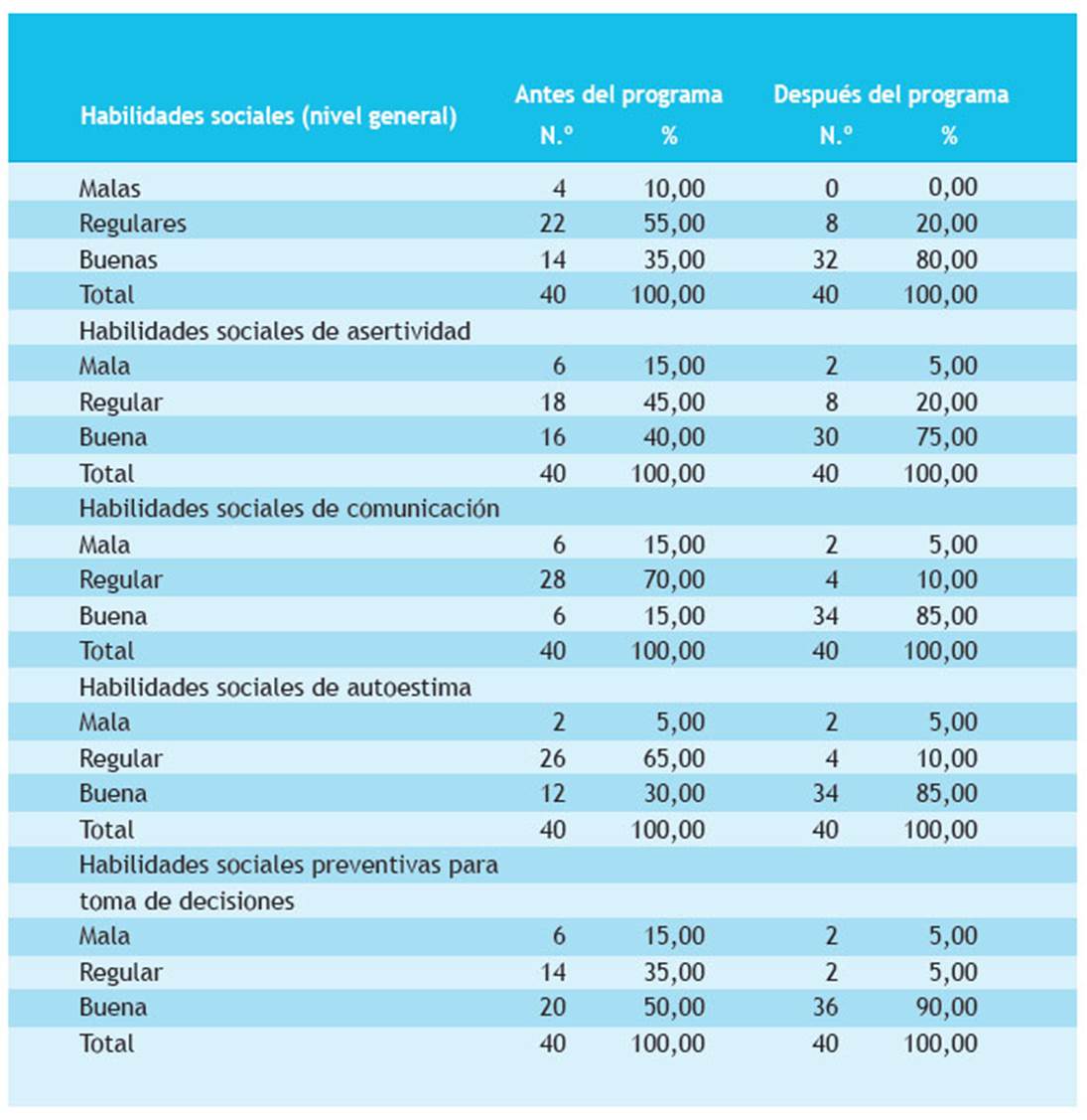 Antes de aplicar el programa "Libres de COVID-19", las habilidades sociales preventivas de los adolescentes atendidos en el Hospital Provincial Tayabamba fueron malas (en el 10,00 % de los participantes), regulares (en el 55,00 %) y buenas (en 35,00 %); y después del programa habían cambiado a malas (0,00 %), regulares (20,00 %) y buenas (80,00 %). Asimismo, en relación a las dimensiones de las habilidades sociales preventivas, encontramos que los valores de la asertividad, previos al programa, fueron malos (15,00 % de los adolescentes), regulares (en 45,00 % del grupo) y buenos (en el 40,00 %); después del programa fueron malos (5,00 %), regulares (20,00 %) y buenos (75,00 %). Al inicio del estudio, las habilidades de comunicación en el 15,00 % de los participantes fueron malas; regulares, en el 70,00 %; y buenas, en el 15,00 %; después del programa fueron malas (5,00 %), regulares (10,00 %) y buenas (85,00 %).