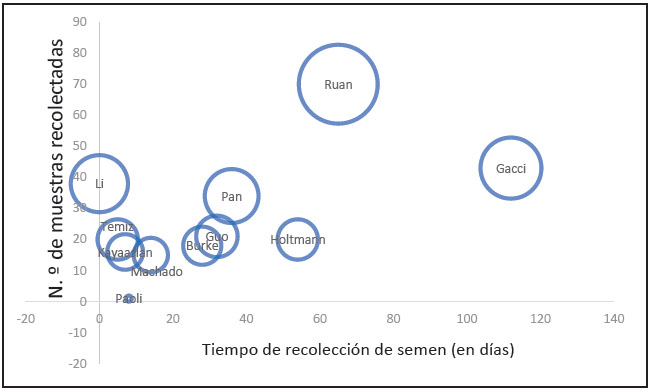 Figura 2 Diagrama de dispersión del número de muestras recolectadas y el tiempo de recolección de semen. El tamaño de cada punto de datos indica el tamaño de muestra correspondiente