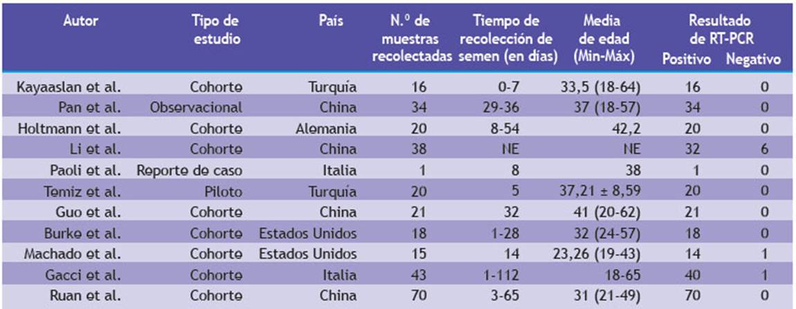 En una serie de casos, Holtmann et al. (2020) 20 describieron el análisis del semen de 34 varones con una edad promedio de 42,2 años, que fueron calificados como pacientes en convalecencia (pacientes infectados por SARS-CoV-2 confirmado mediante la prueba RT-PCR o anticuerpos), grupo control negativo (conformado por 14 varones) y pacientes con infección aguda. En este estudio, el tiempo promedio de obtención de una muestra de semen tras la finalización de los síntomas fue de 32,7 días, y no se detectó SARS-CoV-2 mediante RT-PCR en el semen de hombres convalecientes y con infección aguda.