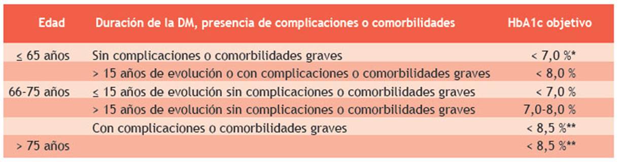* Puede plantearse un objetivo de HbA1c ≤ 6,5 % en los pacientes más jóvenes y de corta evolución de la diabetes en tratamiento no farmacológico o con monoterapia.