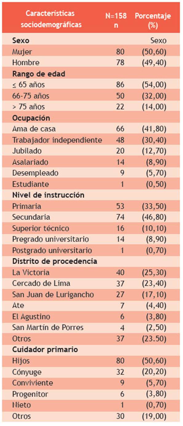 El 54,00 % (n = 86) fueron menores de 65 años, 32,00 % (n = 50) tenían entre 66-75 años, y 14,00 % (n = 22), más de 75 años. La ocupación que predominó fue la de ama de casa con un 41,80 % (n = 66), seguida de trabajador independiente (30,40 %) y jubilado (12,70 %). El nivel de instrucción más común fue la educación secundaria con un 46,80 % (n = 74), luego la educación primaria (33,50 %), superior técnico (10,10 %), pregrado universitario (8,90 %) y posgrado universitario (solo un encuestado). El distrito del cual provenía el mayor número de encuestados fue La Victoria (25,30 %; n = 40), le siguieron el Cercado de Lima (23,40 %) y San Juan de Lurigancho (17,10 %). Todos ellos son distritos colindantes al hospital. Como cuidador primario, el familiar más representativo fue el hijo para 80 de los participantes (50,60 %), y luego el cónyuge, con el 20,30 % (n = 32) (Tabla 2).