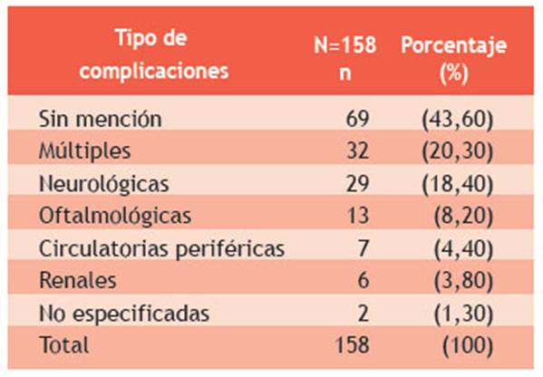 Los pacientes con múltiples complicaciones fueron las más numerosos con 20,3 % (32 casos), seguido de las alteraciones neurológicas (18,40 %; n = 29), las complicaciones oftalmológicas (8,20 %), las circulatorias periféricas (4,40 %,) y las renales (3,8 %). El 43,60 % (n = 69) de los pacientes no tuvieron complicaciones (Tabla 3).