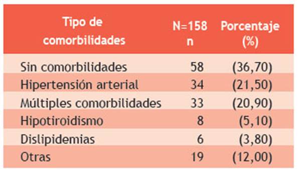 La Tabla 4 muestra las comorbilidades de los pacientes: la hipertensión arterial fue la más frecuente (21,50 %; n=34), luego el hipotiroidismo (5,10 %), las dislipidemias (3,80 %) y otras (12,00 %). Mientras que el 20,90 % (n=33) de los encuestados tuvo múltiples comorbilidades.