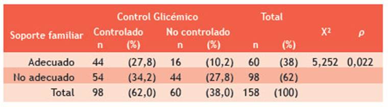 De los 158 pacientes encuestados, 98 (62,00 %) tuvieron un control glicémico controlado y de estos 44 (44,9%) un soporte familiar adecuado. De los 60 no controlados, 16 (26,6%) tuvieron un soporte familiar adecuado. Se determinó la asociación entre soporte familiar y control glicémico mediante la prueba de ji al cuadrado, que fue estadísticamente significativa X2 = 5,252, con un ρ = 0,022 (Tabla 5).