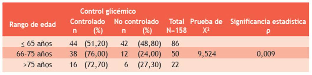 Según el rango de edad, el grupo que mostró un mejor control glicémico fue el de los menores de 66 años (44,90 %), seguido del grupo de 66 a 75 años (38,80 %) y por el de los mayores de 75 (16,30 %). La variable "rango de edad" tuvo una asociación significativa con el control glicémico siendo la prueba X2 = 9,524, con un ρ = 0,009 (Tabla 6).