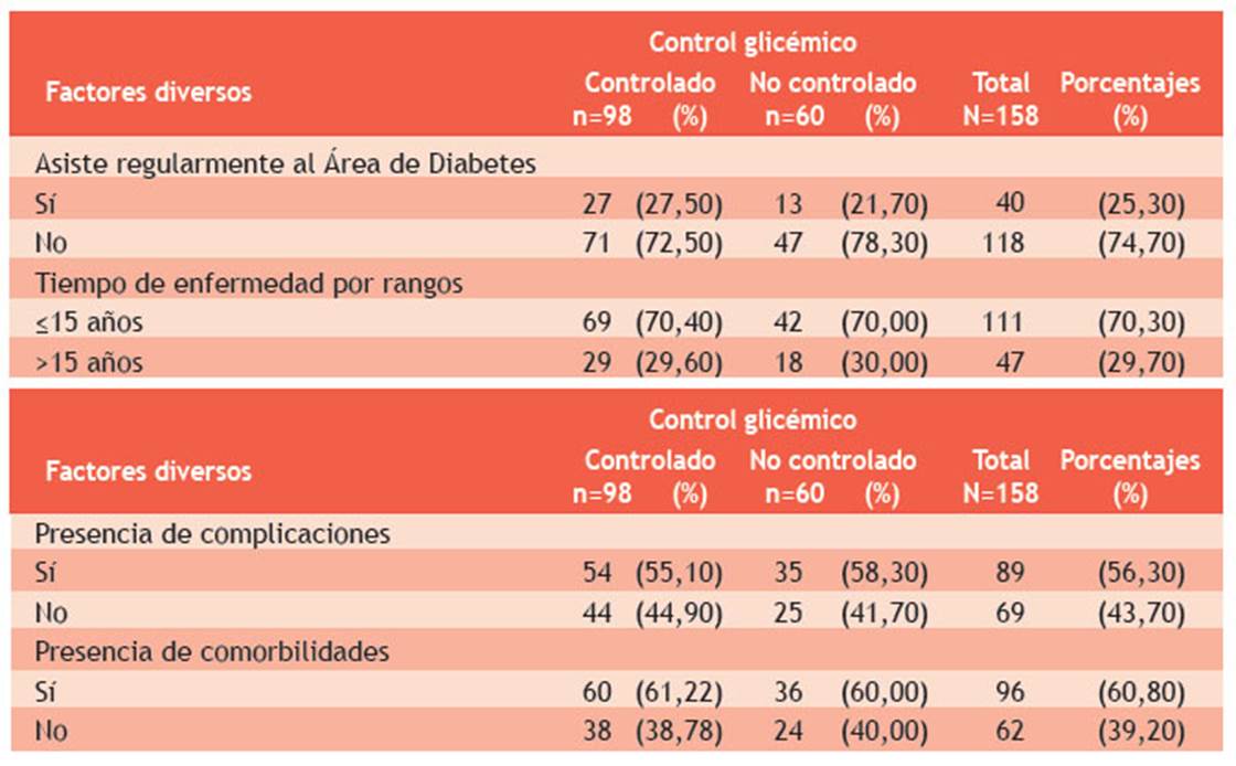 Además de ello, 40 (25,30 %) de los 158 sujetos evaluados asisten regularmente al área de diabetes, de estos, 27 (67,50 %) tienen un control adecuado de la glicemia. De los 98 con control glicémico adecuado, 69 (70,40 %) tienen un tiempo de enfermedad menor o igual a 15 años. De los 98 pacientes adecuadamente controlados, 54 (55,10 %) tienen complicaciones. Mientras que del grupo de 96 encuestados con comorbilidades, el 61,22 % (n = 60) controlan bien la glicemia (Tabla 7).
