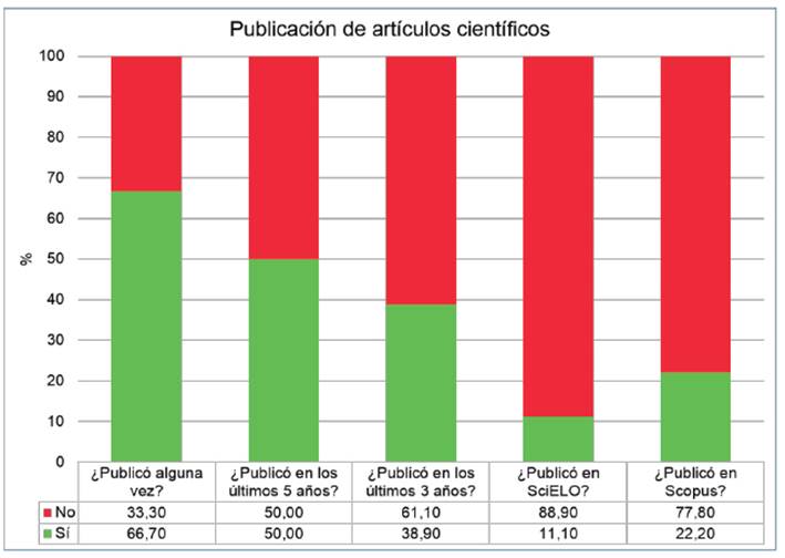 Nuestro hallazgo (66,70 % de asesores que tiene un artículo publicado al menos) difiere de los resultados de dos investigaciones desarrolladas en asesores de la carrera de Medicina. En la primera, el 47,10 % publicó alguna vez; 14,70 %, en los últimos tres años, y el mismo número, en los últimos cinco años. Con respecto a la base de datos, en SciELO apareció el 20,60 % de los artículos; en Scopus, el 14,70 % 10. En la segunda investigación, Taype-Rondán et al. encontraron que el 41,80 % tuvo, al menos, un artículo publicado 9.