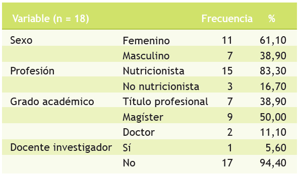 La tabla 1 muestra que 61,10 % de los asesores (n = 18) era del sexo femenino. El 83,30 % eran nutricionistas y el 50,00 % tenían el grado de magísteres. Encontramos solo un asesor que era docente investigador.
