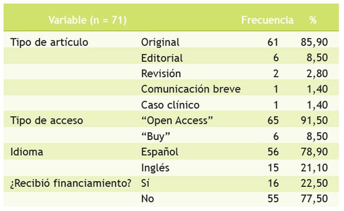 El 85,90 % de las publicaciones fueron artículos originales. Las revistas de acceso libre (Open access) fueron elegidas por el 91,50 % de los autores. El mayor número de investigaciones fue redactada en español (78,90 %), y solo el 22,50 % ha recibido apoyo financiero (Tabla 2).