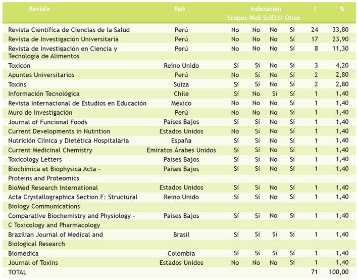 Setenta y un artículos fueron publicados, los cuales corresponden a 12 asesores (n = 12). El 69,00 % apareció en la Revista Científica de Ciencias de la Salud, la Revista de Investigación Universitaria y la Revista de Investigación en Ciencia y Tecnología de Alimentos que pertenecen a la UPeU, y no están indizadas en una base de datos que demuestre alta calidad (Scielo, Scopus o WoS) (Tabla 3).