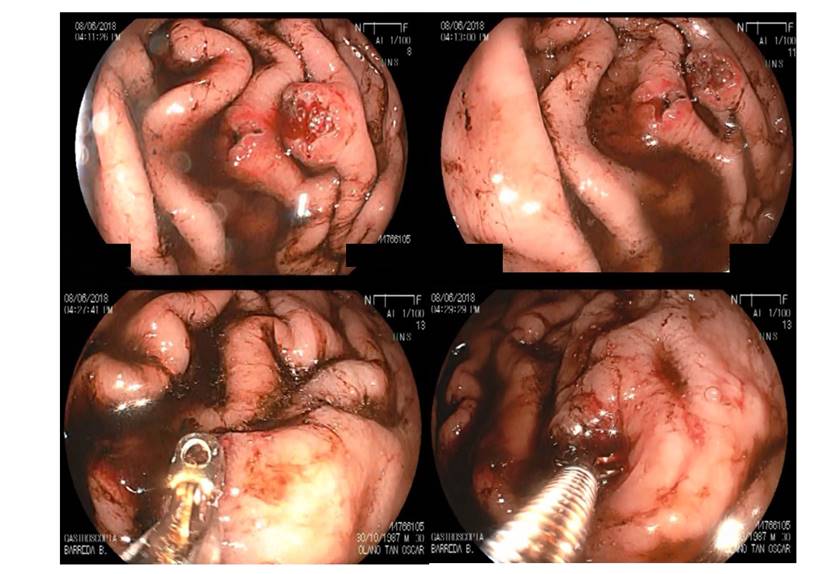 Con dichos resultados, el paciente es referido a otra institución de salud y se hospitaliza. En el examen físico, se evidencia taquicardia y piel pálida; el resto del examen no mostró hallazgos significativos. En los exámenes de laboratorio presenta hemoglobina 4,2 mg/dl, microcítica hipocrómica, y el perfil bioquímico y hepático, dentro de los valores normales.