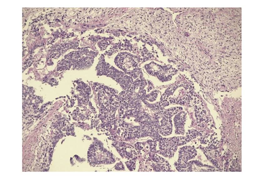 Figura 3 Carcinoma embrionario, caracterizado por un patrón seudoglandular y el aspecto epitelioide de las células (10 X)
