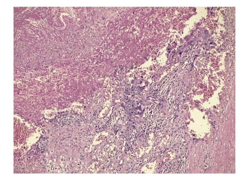 Figura 4 Coriocarcinoma que se caracteriza por células citotrofoblásticas y células sinciciotrofoblásticas en un fondo con extensa necrosis y hemorragia (10 X)