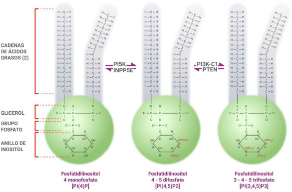 El fosfatidilinositol (PI) puede fosforilarse a través de cinasas específicas y de forma selectiva en las posiciones 3, 4 y 5 para generar siete especies únicas, de las cuales tres son monofosfatos; tres, bifosfatos, y un trifosfato 11. Los monómeros son el fosfatidilinositol 3 fosfato (PI3P), asociado con la formación de membranas endosómicas y con la preformación de autofagosomas, presumiblemente en el retículo endoplásmico12; el fosfatidilinositol 4 fosfato (PI4P), aún sin un rol claro en regulación celular, pero que es un substrato importante en la formación de fosfatidilinositol 4,5 bifosfato 13; y el fosfatidilinositol 5 fosfato (PI5P), que tiene funciones regulatorias 14. Los bifosfatos son los siguientes: el fosfatidilinositol 4,5 bifosfato [PI(4,5)P2], intermediario esencial que, a través de la estimulación de un receptor, activa la fosfolipasa C (PLC) que hidroliza PI(4,5)P2 para generar diacilglicerol (DAG) e inositol-1,4,5-trisfosfato (IP3), los cuales inician así una cascada de señalización en relación a la liberación de calcio del retículo endoplásmico 15; el fosfatidilinositol 3,5 bifosfato [PI(3,5)P2], que no ha sido suficientemente estudiado, pero tendría injerencia en la homeostasis celular y en la adaptación16; el fosfatidilinositol 3,4 bifosfato [PI(3,4)P2], que parece tener un papel significativo en la migración celular mediante la unión a reguladores citoesqueléticos específicos17. Finalmente, el fosfatidilinositol 3,4,5 trifosfato [PI(3,4,5) P3], que sería el más importante en relación a su función celular (Figura 1).